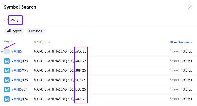 Indices boursiers (ES, MES, NQ, MNQ, YM, MYM, RTY, M2K) → Trimestriel (mars, juin, septembre, décembre).