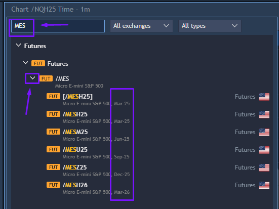 2️⃣ A new search window will appear. Search for the instrument you want, open the dropdown menu, and select the correct expiration for your instrument.