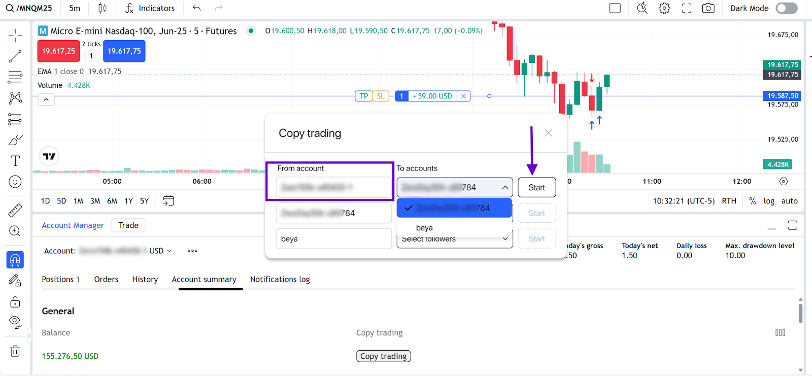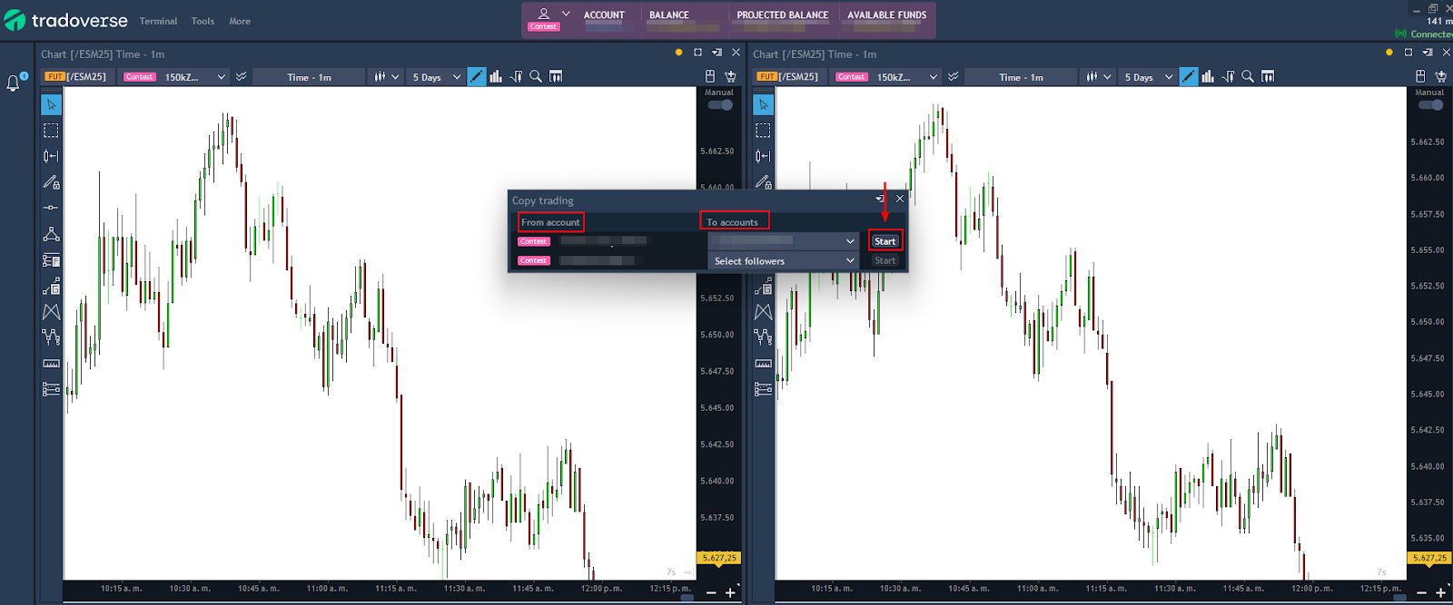 2️⃣A window will open where you'll find your active accounts. In the "From Account" column, choose the main account where you'll be taking your trades. In the "To Accounts" column, select the account or accounts where you want your trades to be replicated. Once you've selected the accounts, click "Start".